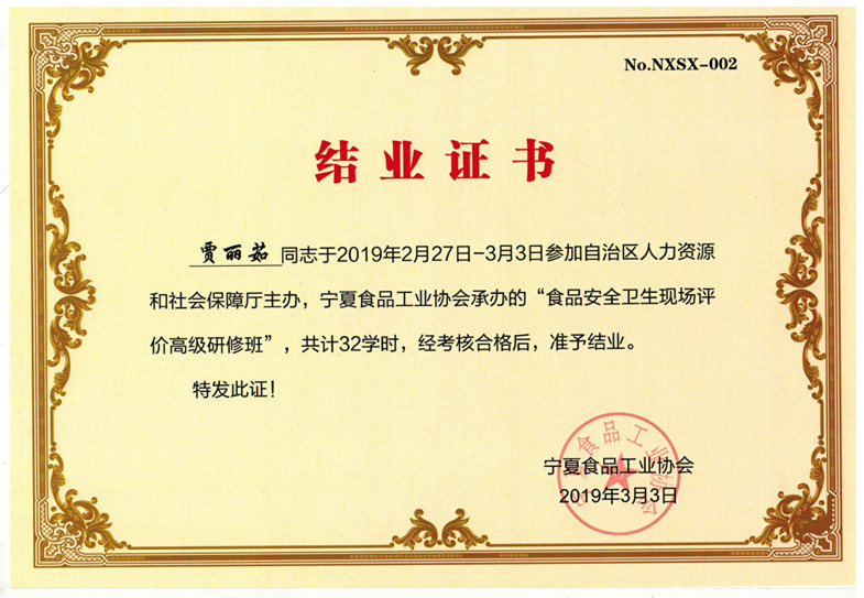 寧夏食品安全協(xié)會(huì)培訓(xùn)結(jié)業(yè)考核證書(shū)