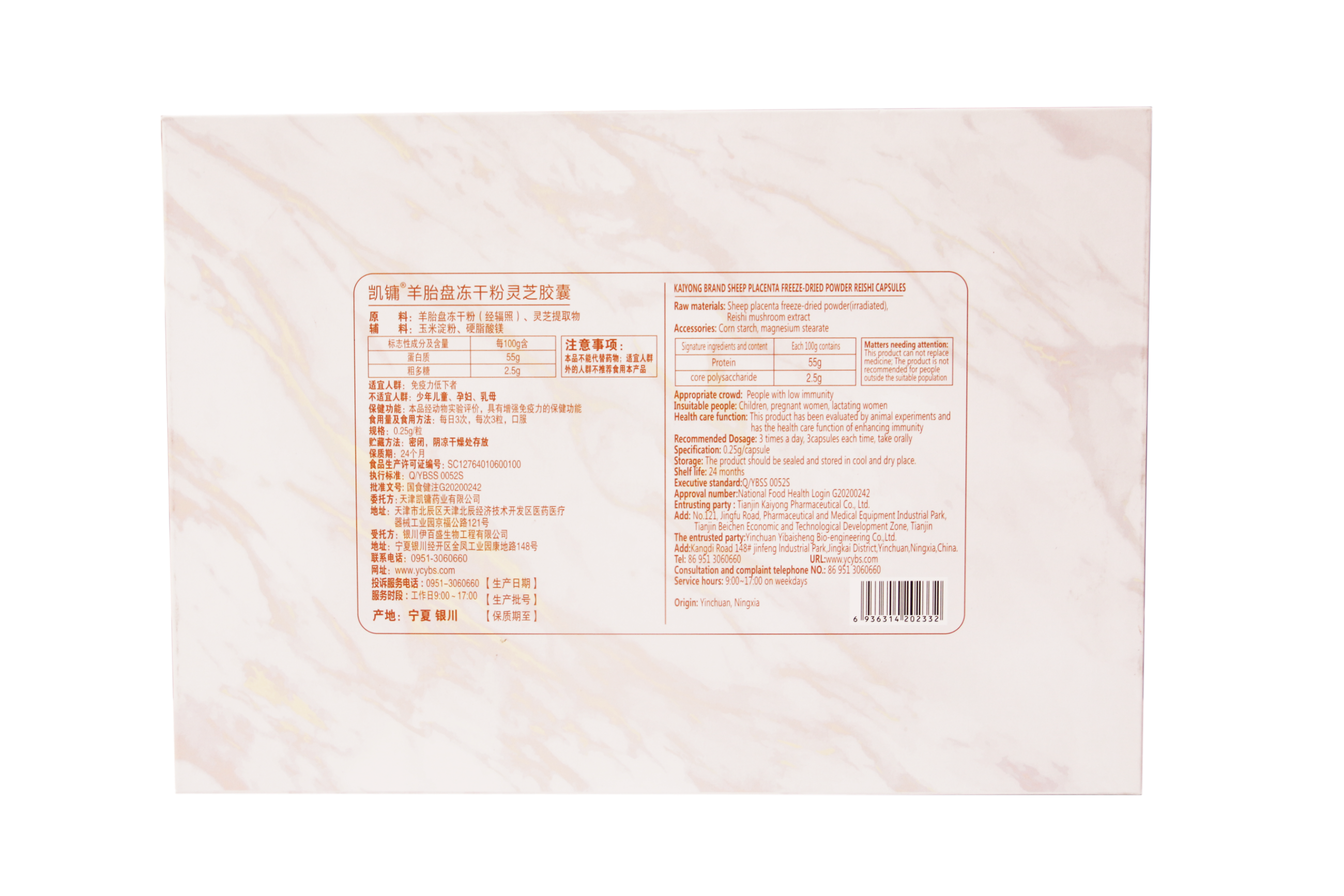 原料:羊胎盤凍干粉(經(jīng)輻照)、靈芝提取物